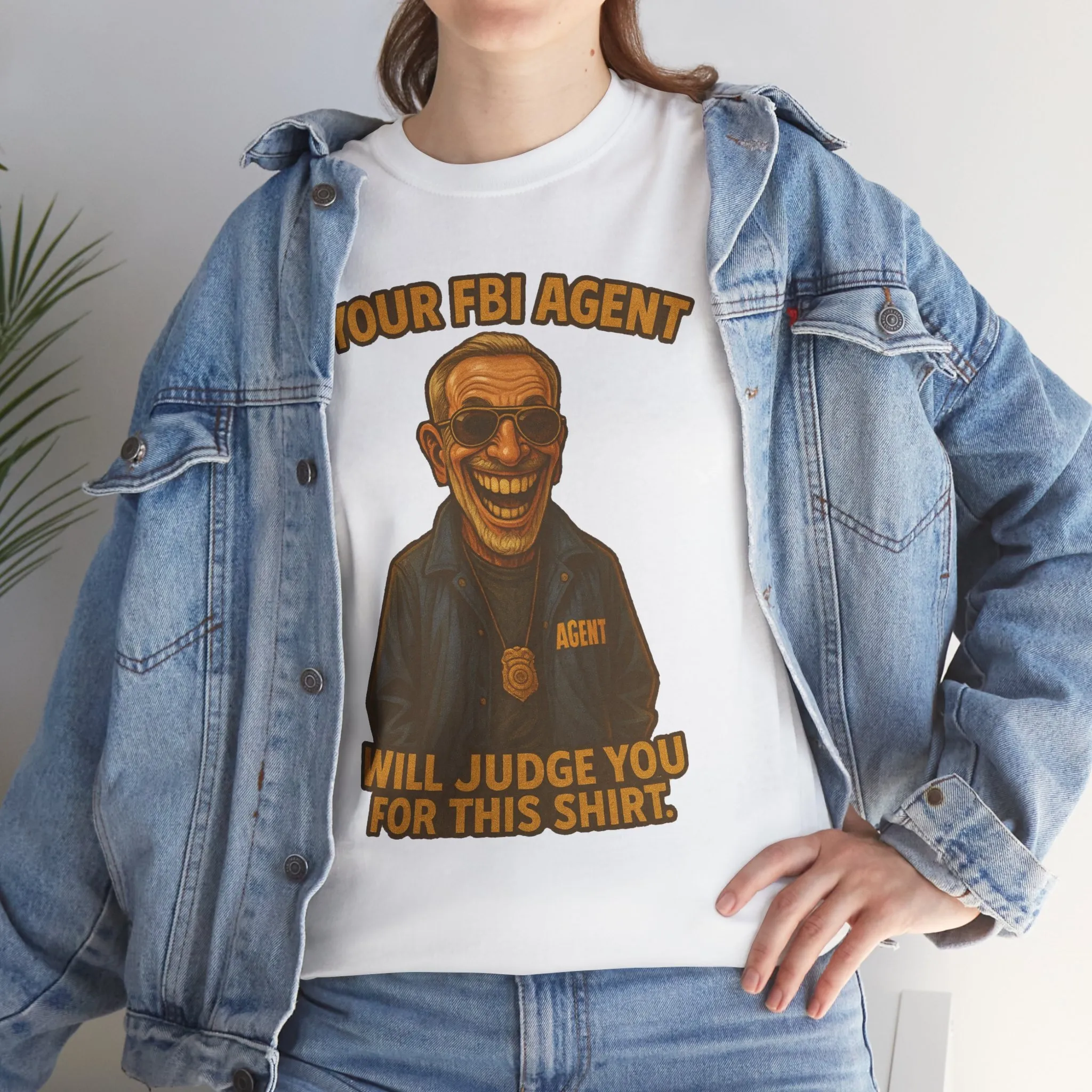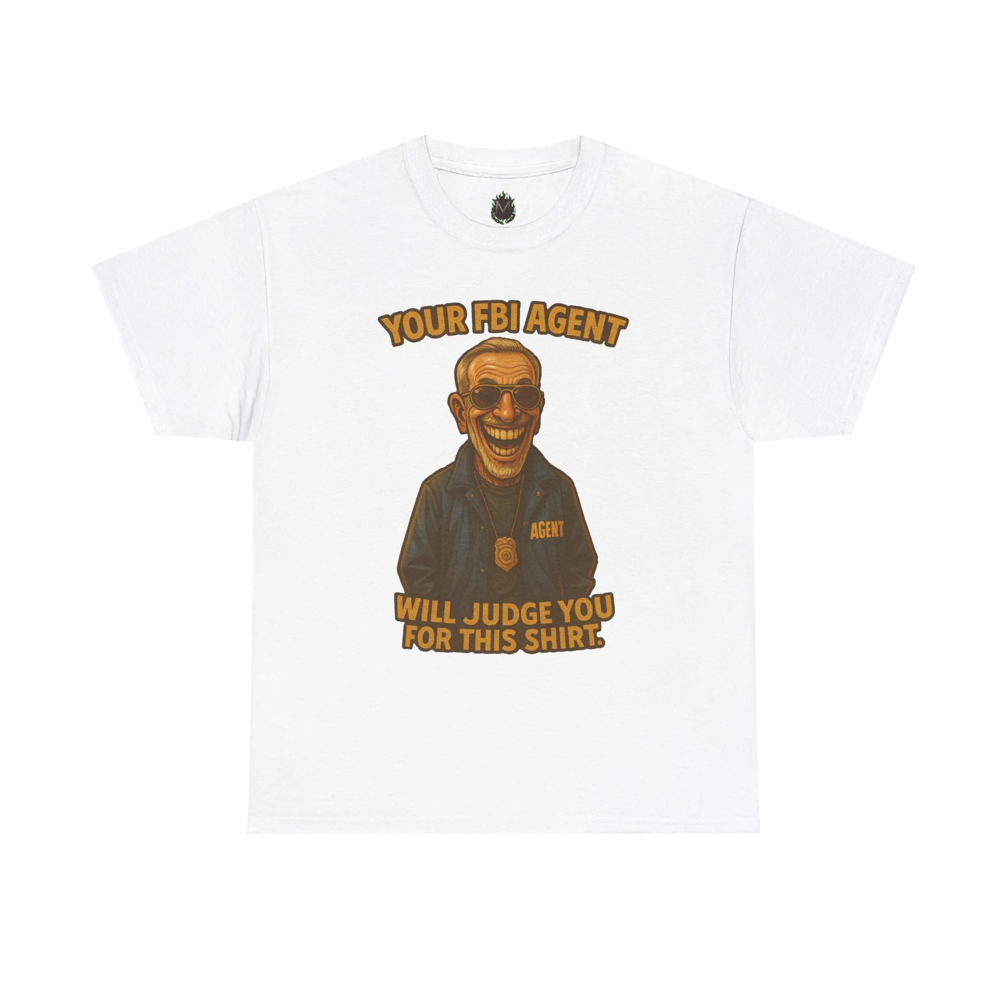 This design leans fully into paranoia humor, featuring a smug, grinning agent who looks way too comfortable knowing your browsing history. Equal parts satire and self-awareness.